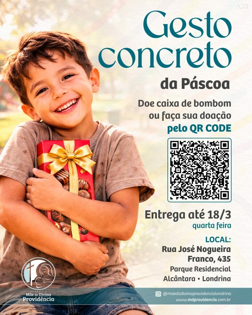 Estamos organizando o Gesto Concreto da Páscoa e você pode nos ajudar doando uma caixa de bombom ou contribuindo pelo QR Code.