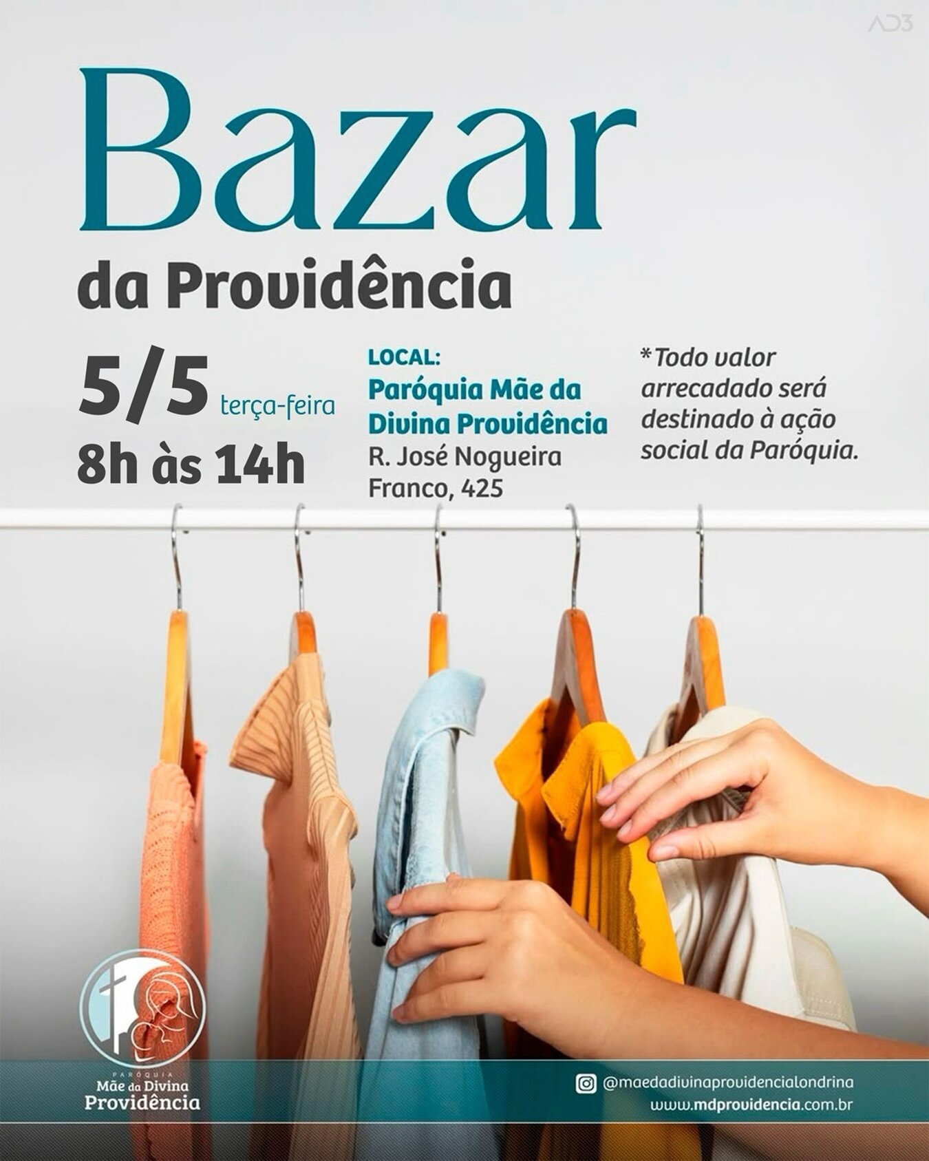Na terça-feira, 05 de maio, das 8h às 14h, nossa paróquia promove mais um bazar. É uma ótima oportunidade para encontrar roupas e itens com preços acessíveis, e ao mesmo tempo ajudar quem mais precisa.